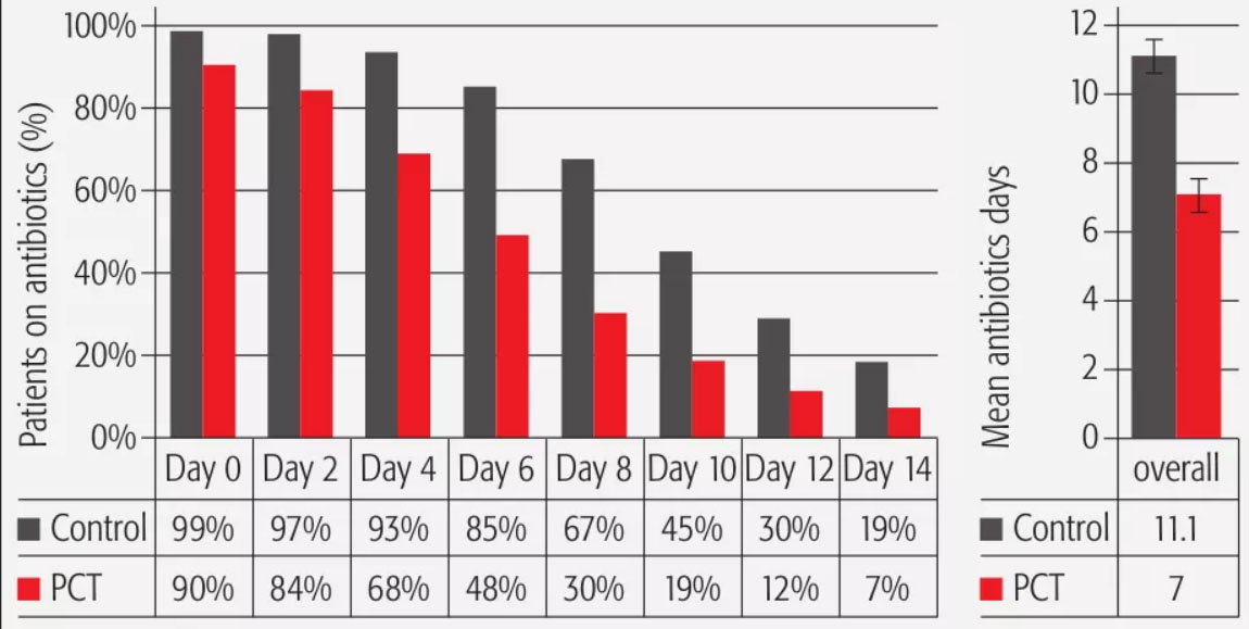 由此可见,通过使用PCT指导抗生素治疗可以减少约40%的抗生素疗程,平均抗生素用药时间从11.1天降为7天。同时预后良好,且没有增加感染复发的风险。相反,如果PCT浓度持续升高,预示着脓毒血症发生的风险上升,病情可能比临床症状表现出来的更加严重。